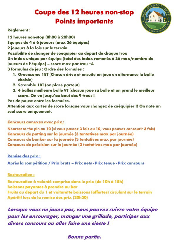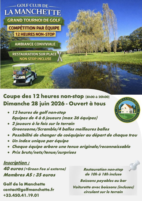 En savoir plusLe jour le plus long... le dimanche 22 juin, défendez les couleurs de votre équipe (4 à 6 joueurs/joueuses) sur le parcours de la Manchette ! 10 h de golf non-stop - 2 joueurs/joueuses de votre équipe sur le terrain - Possibilité de changer de coéquipier au départ de chaque trou - Départ en shotgun à 8h - Formule : Greensome 18T+ Scramble 18T + 4 Balles Meilleure Balle 9T De nombreux prix pour récompenser la performance et la créativité des équipes ! cliquez sur EN SAVOIR PLUS pour afficher le règlement !